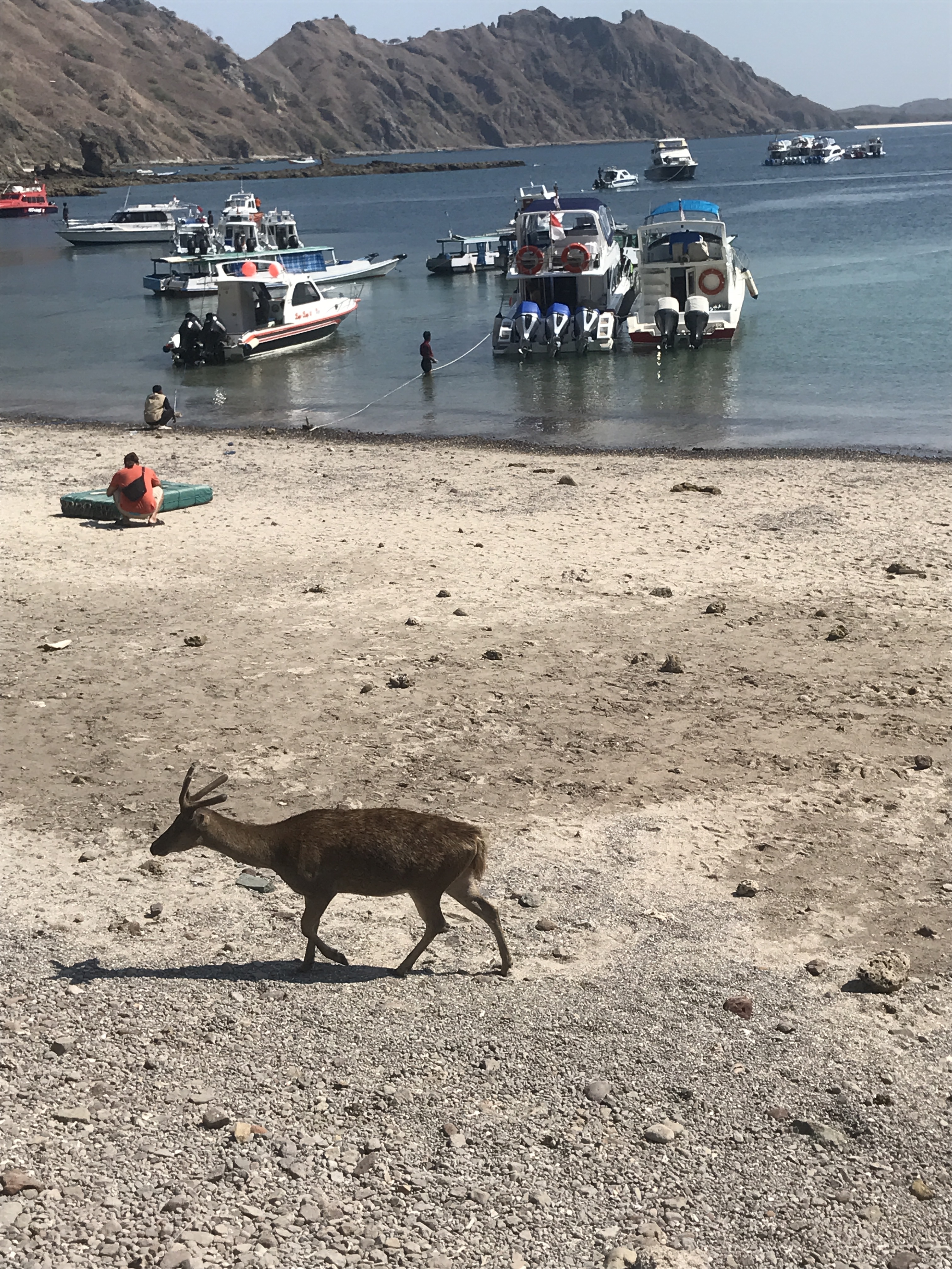 Padar Island appears to be completely undeveloped. The spot where we land is within a small bay flanked by headlands. The beach itself is pleasant, although not spectacular. Its major highlight on this occasion is the arrival of a couple of deer who join us on the beach foraging for food. The deer are foraging, not us.